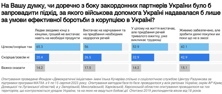 Більше половини опитаних (55%) погоджувалися з тезою, що військова допомога Україні має надаватися закордонними партнерами за умови ефективної боротьби з корупцією.
