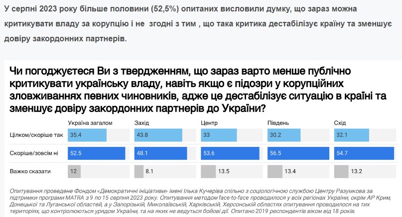 У серпні 2023 року більше половини (52,5%) українців висловили думку, що зараз можна критикувати владу за корупцію